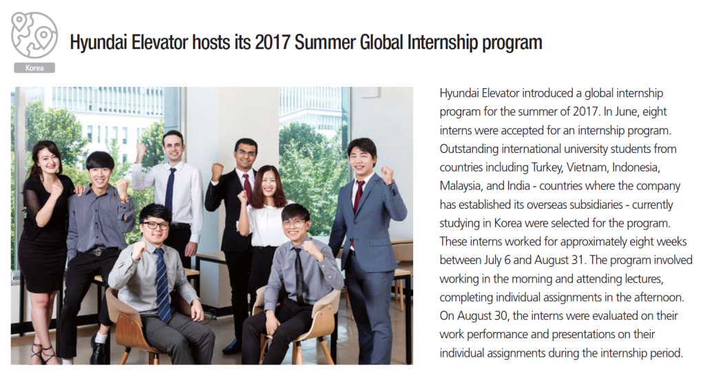 2017년 8월에 현대엘리베이터 국제영업부에서 인턴으로 활동했습니다. 인턴 기간 동안 우수 프로젝트상을 수상했습니다.